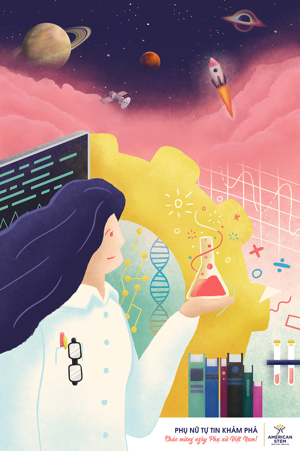 I started working at AmericanSTEM Vietnam first as a Marketing Intern, then moved up as Marketing Executive, then finally, in 2019, as Art Director. In a start-up environment, and as someone who enjoys seeking new ways to solve new and existing problems, my skillset grew broadly as necessitated: digital painting, video editing, photography, front-end development, performance marketing, interior design, motion graphic... — to name a few. Once becoming entrusted and promoted as the brand's Art Director, I was in charge of refreshening its guidelines, assets, developing the new website and overseeing all visual aspects of it henceforth.